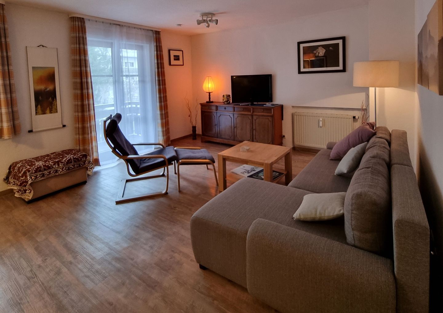 Die gemütlich eingerichtete Ferienwohnung hat einen überdachten West-Balkon, von dem man einen freien Blick auf die Berge der Hörnerkette mit Bergbahn und Skipiste hat.