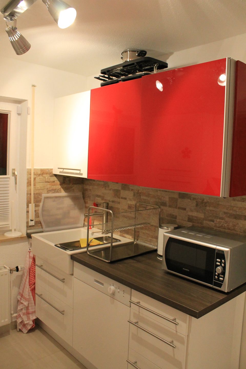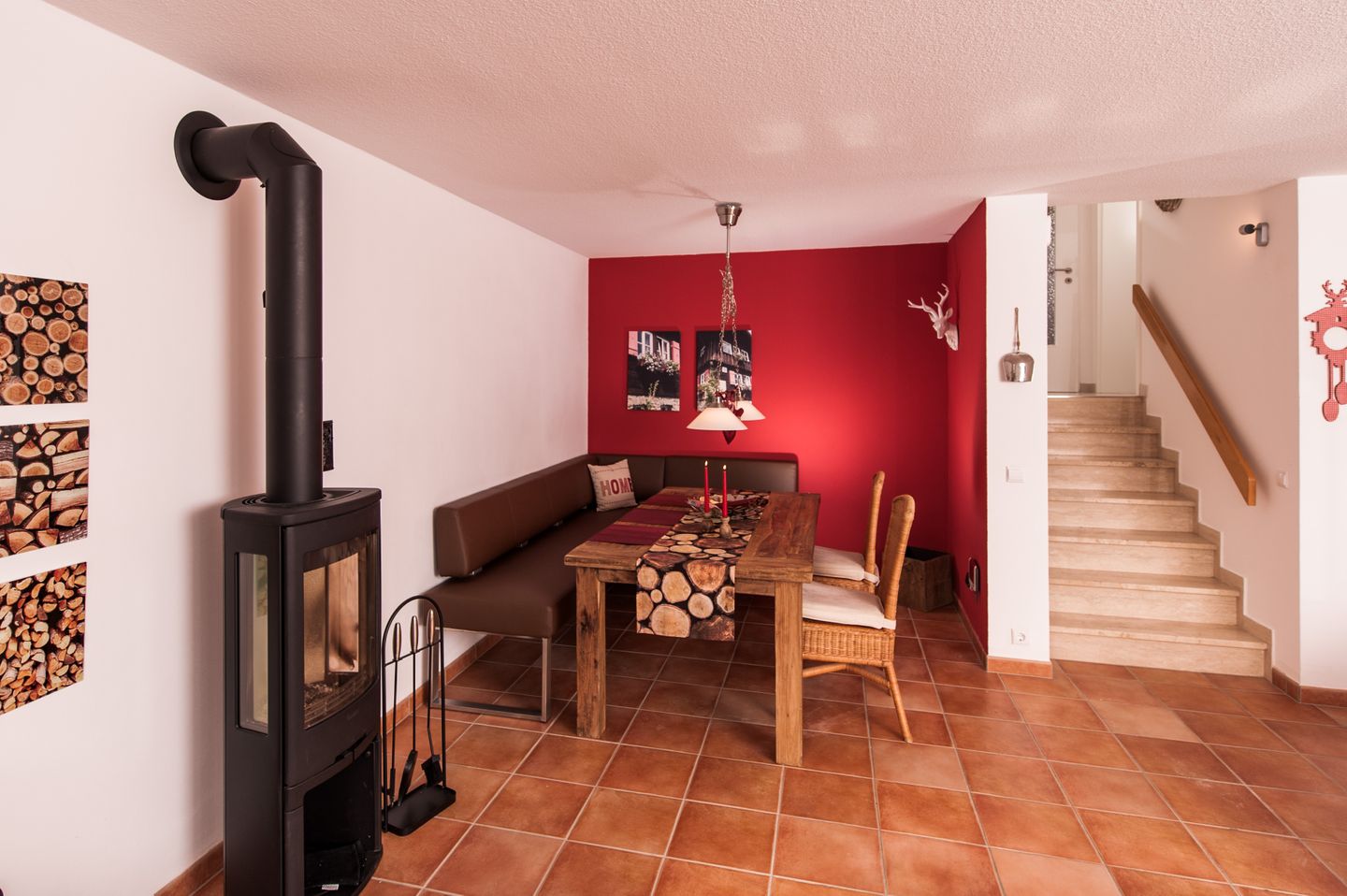 Ein Wohnzimmer mit TV und Sitzlandschaft, gemütlichem Essplatz und Zugang zu einem der beiden Süd-west-Balkone. - eines mit einem dekorativem Schwedenofen.