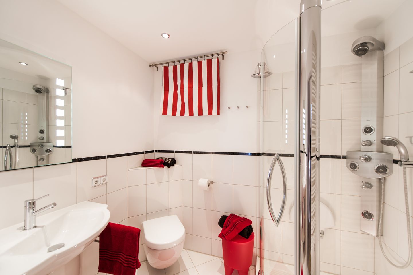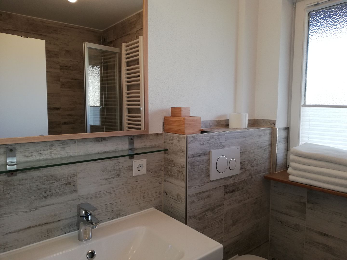 Bad mit WC, Dusche oder Duschwanne, Waschbecken.